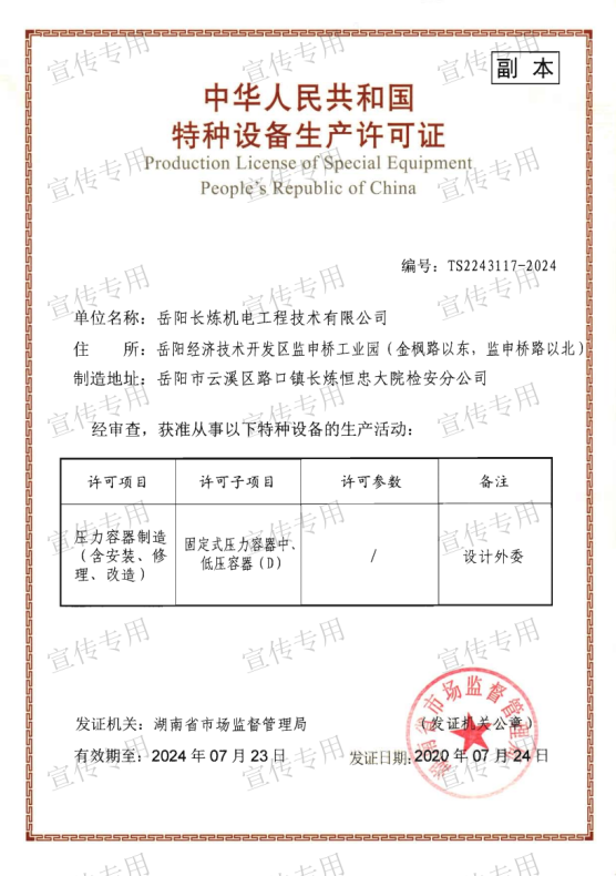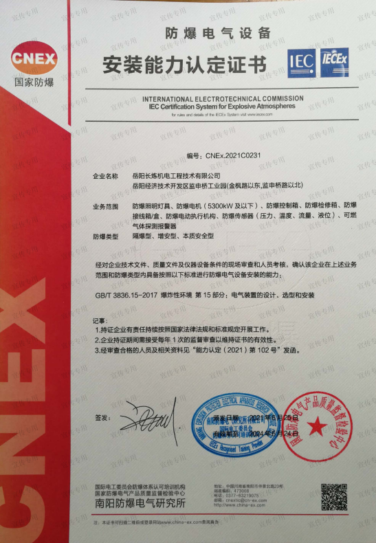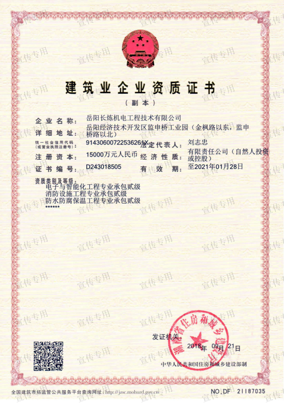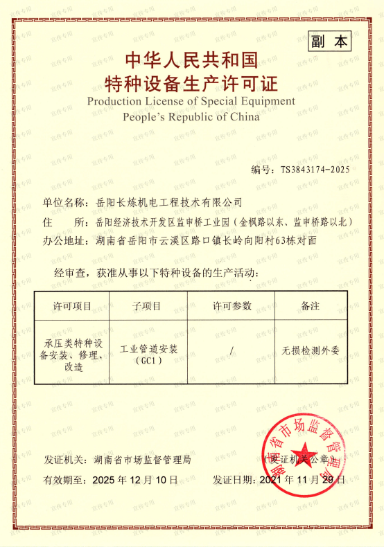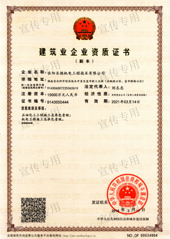 公司擁有石油化工工程施工總承包壹級(jí)資質(zhì)、機(jī)電工程施工總承包壹級(jí)資質(zhì)、檢維修能力評(píng)定(9大類38項(xiàng))、建筑工程施工總承包叁級(jí)資質(zhì)、電力工程施工總承包叁級(jí)資質(zhì)、環(huán)保工程專業(yè)承包叁級(jí)資質(zhì)、消防設(shè)施工程專業(yè)承包貳級(jí)資質(zhì)、防水防腐保溫工程專業(yè)承包貳級(jí)資質(zhì)、電子與智能化工程專業(yè)承包貳級(jí)資質(zhì)、施工勞務(wù)不分等級(jí)資質(zhì)、兩化(工業(yè)化、信息化)融合管理體系認(rèn)證、A級(jí)工業(yè)設(shè)備高壓水清洗資質(zhì)、特種設(shè)備生產(chǎn)許可證(中、低壓壓力容器制造(含安裝、修理、改造)(D))、特種設(shè)備安裝改造維修許可證(壓力管道)GC1級(jí)、特種設(shè)備安裝改造維修許可證(鍋爐)1級(jí)、特種設(shè)備安裝改造維修許可證(起重機(jī)械)B級(jí);特種設(shè)備檢驗(yàn)檢測(cè)機(jī)構(gòu)核準(zhǔn)證(安全閥定期校驗(yàn))檢驗(yàn)項(xiàng)目FD1、FD2、承裝(修、試)電力設(shè)施許可證(承裝類二級(jí)、承修類二級(jí)、承試類三級(jí))、防爆電氣設(shè)備安裝、修理資格證書、計(jì)量標(biāo)準(zhǔn)考核證書的二氧化硫氣體檢測(cè)儀檢定裝置、硫化氫氣體檢測(cè)儀檢定裝置、熱電偶標(biāo)準(zhǔn)裝置、可燃?xì)怏w檢測(cè)報(bào)警器檢定裝置、精密壓力表標(biāo)準(zhǔn)裝置、一氧化碳檢測(cè)報(bào)警器檢定裝置等企業(yè)資質(zhì)。公司通過(guò)了中國(guó)質(zhì)量認(rèn)證中心QHSE管理體系認(rèn)證,是中石化施工企業(yè)資源庫(kù)A庫(kù)成員,湖南省建設(shè)網(wǎng)成員單位,湖南省高新技術(shù)企業(yè)。